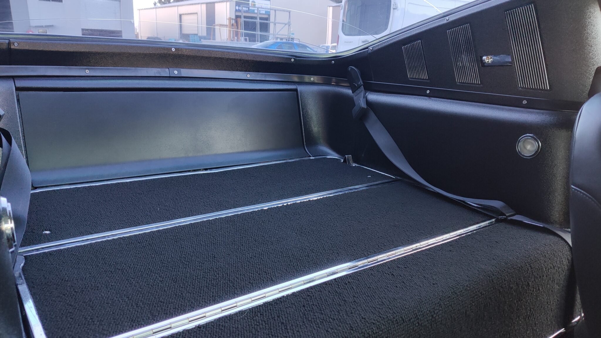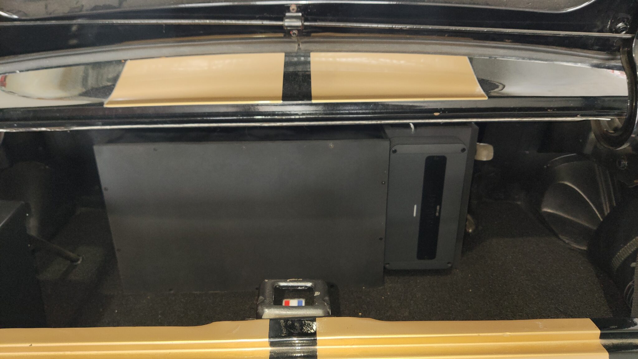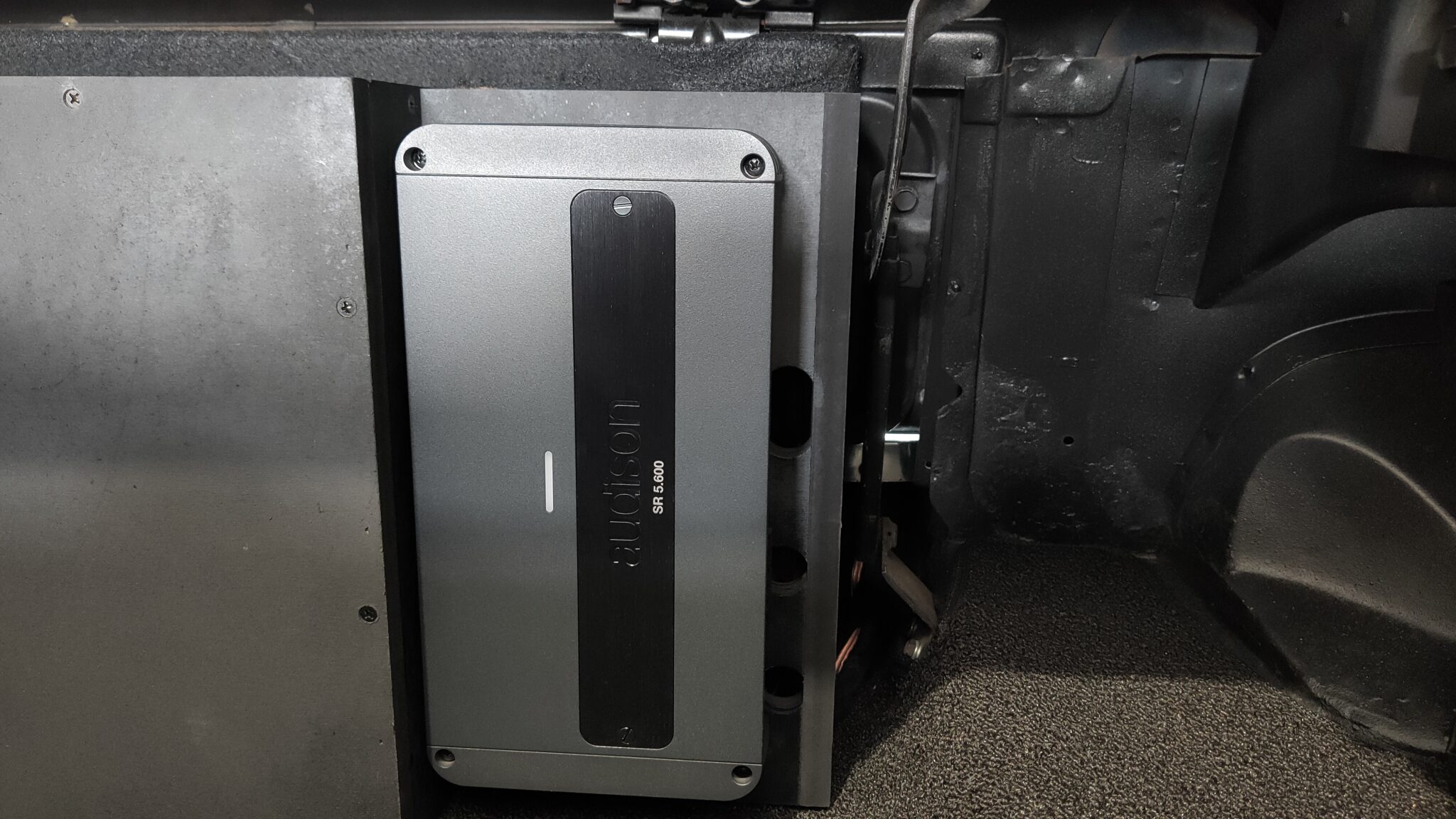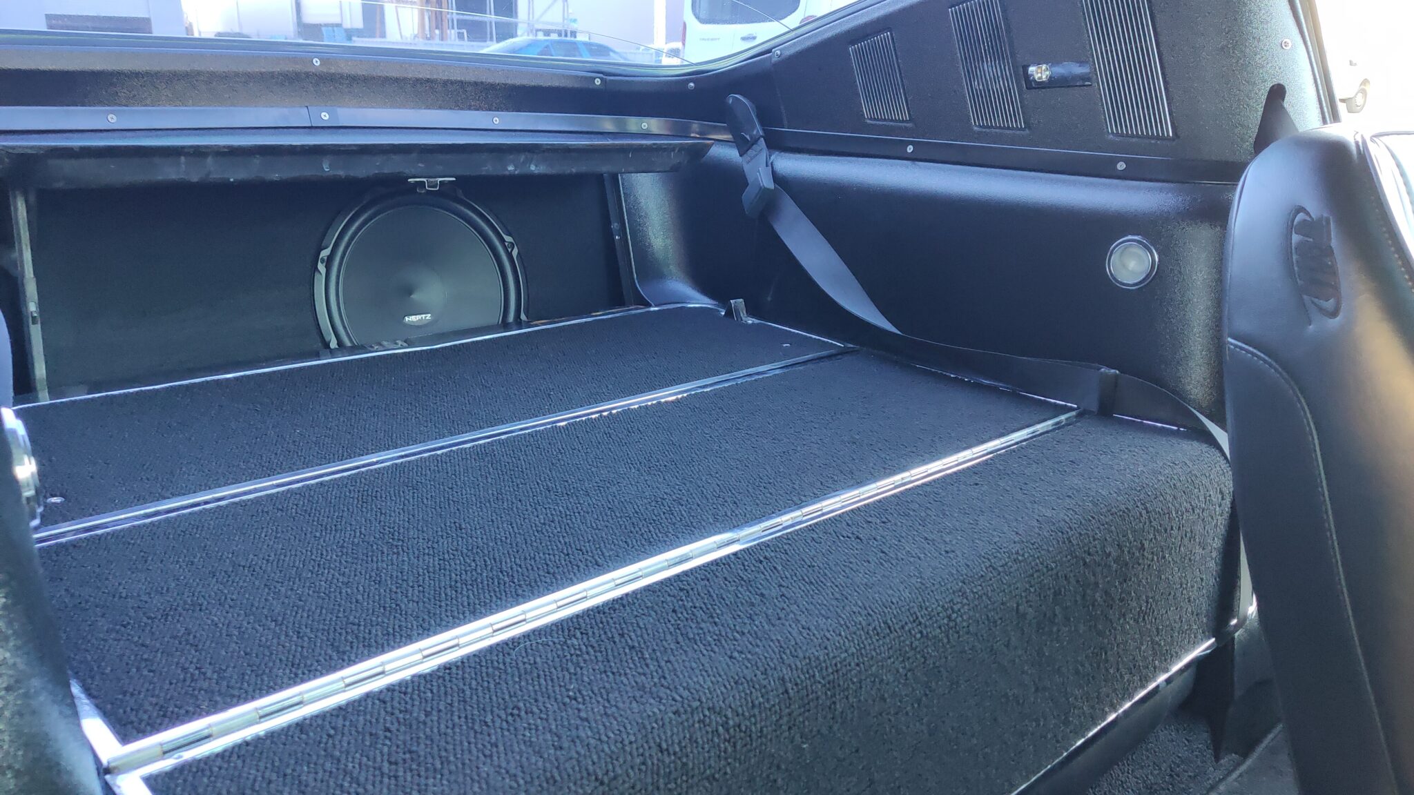 In the trunk we custom fabricated a sub box and amplifier rack with black trim panels to keep it out of site and looking like it match’s the factory interior. A Hertz Cento 12 inch subwoofer takes care of bass duties with an Audison SR5.600 5ch amp powers the system.