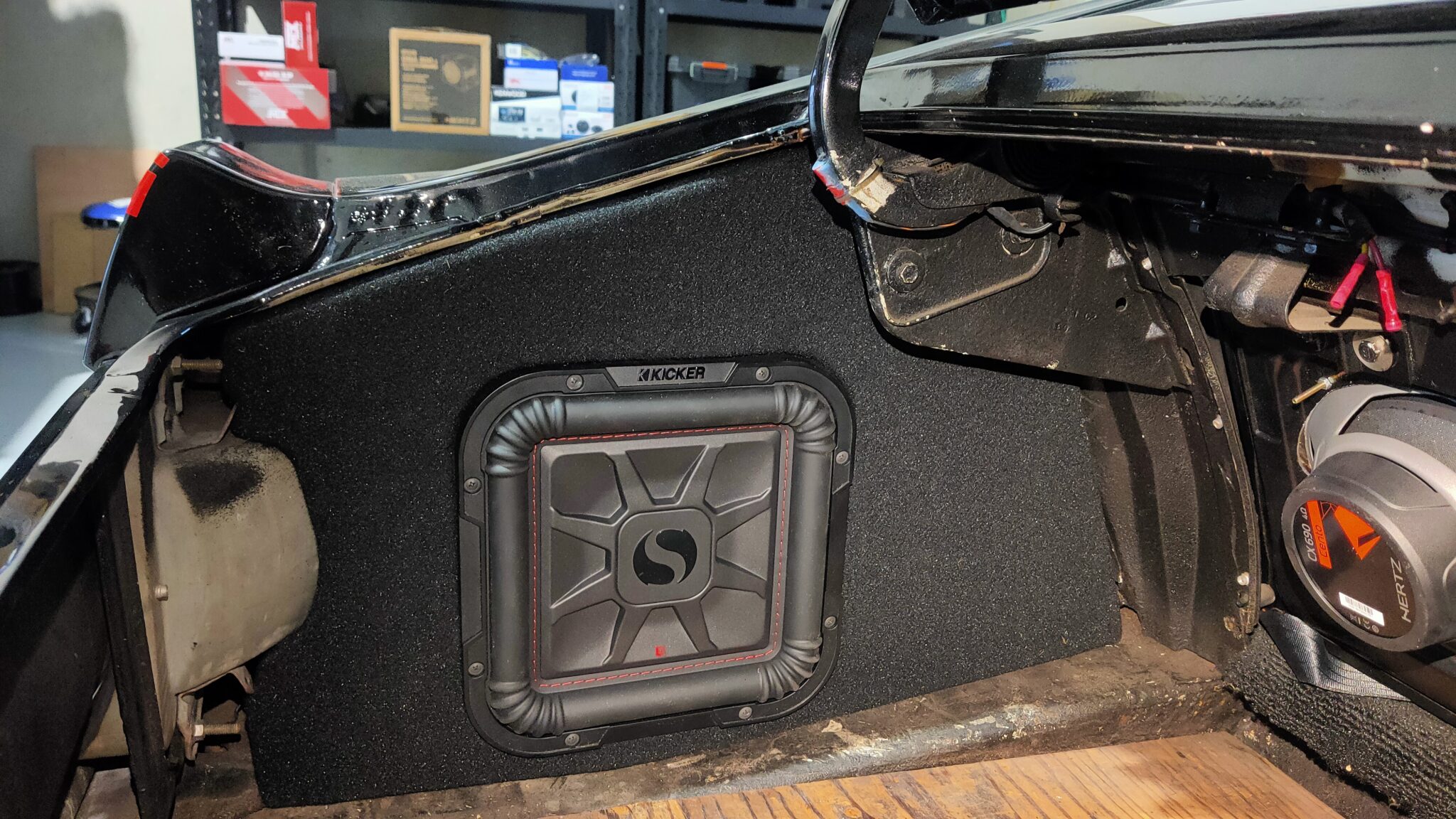 in the trunk we built a custom enclosure to house a Kicker L7T104 10inch square subwoofer and to mount the JL Audio 5ch amplifier.