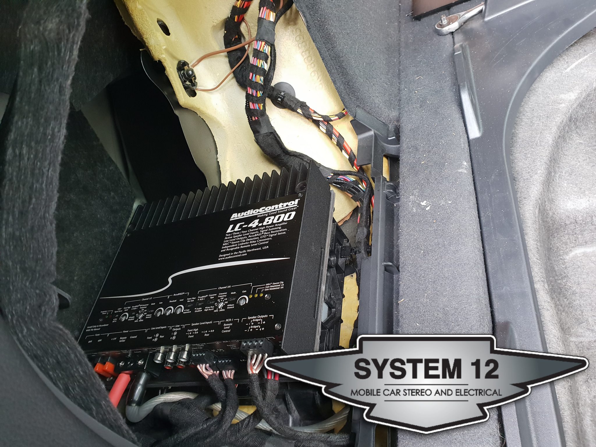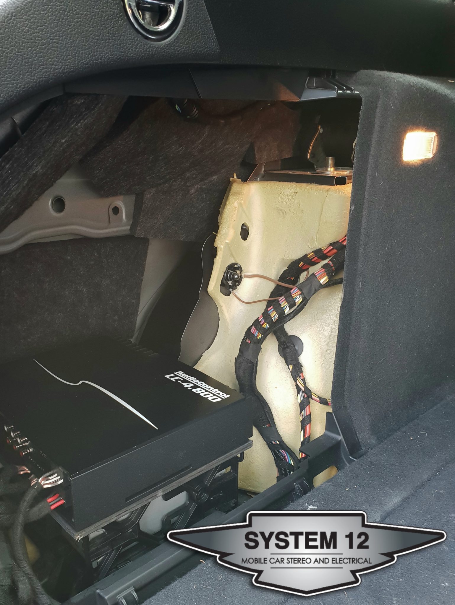 An Audio Control LC4.800 amplifier was mounted in the rear left panel where the factory amp would reside. Integrated into the audio system via the built in hi-level inputs all cabling was then loomed in factory Tesa tape to keep the appearance of the factory looms.