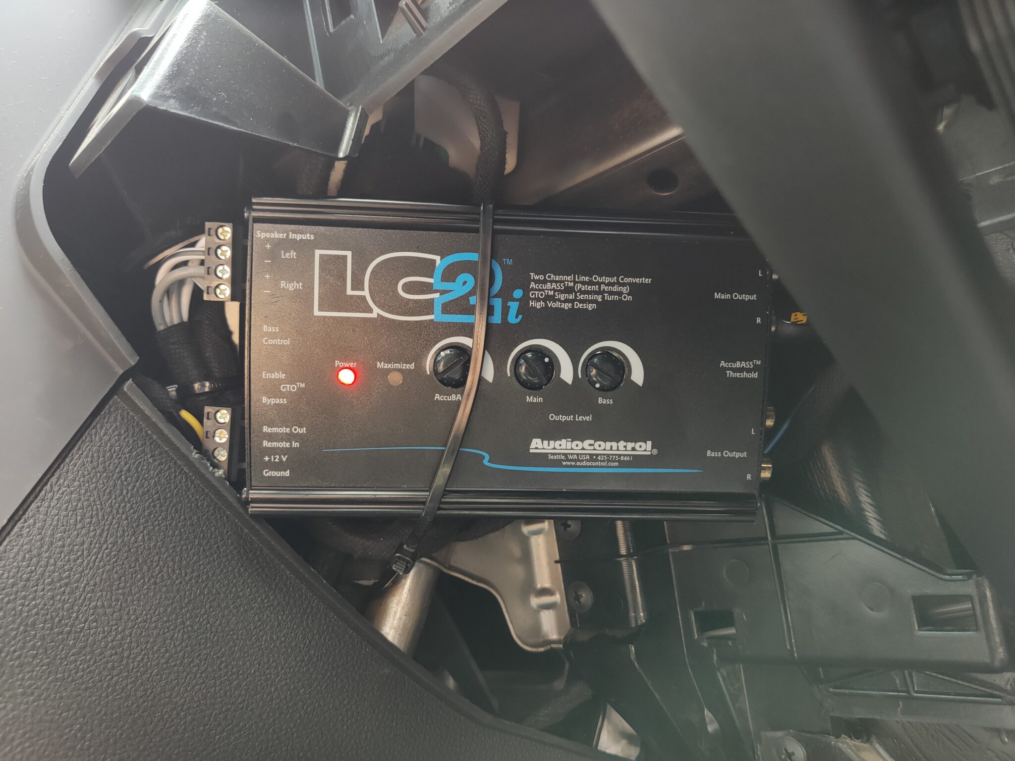 An Audio Control LCi2 hi- low signal converter takes signal from the factory Holden radio and restores bass output before sending a clean low level signal to the MTX Thunder75.4 4ch amplifier.
