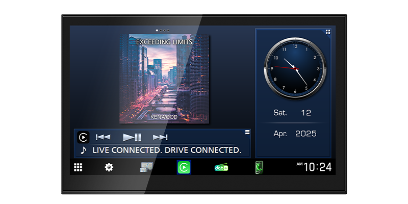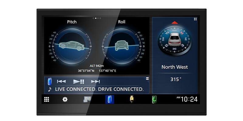 The 8″ home screen is composed of a Driving Widget as well as a Source Control Widget overlaid on the background. You can move the Driving Widget from side to side or enlarge the Source Control Widget to optimize the screen for your intuitive operation. The Driving Widget allows selection of a clock, compass, or equalizer setting, etc., while the background allows selection of album art, audio visualizer, or photo.